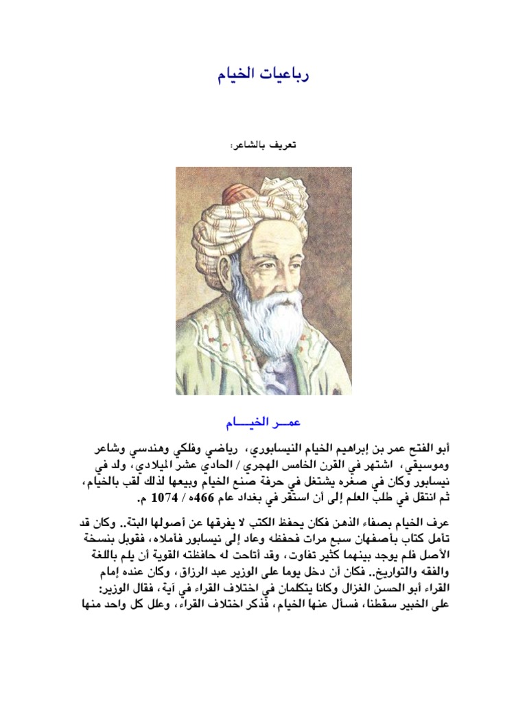 رباعيات عمر الخيام المؤلف : تحويل وإنشاءpdf من أنواع مختلفة من الملفات مثل word doc و excel xls وpowerpoint ppt. Download as pdf or read online from scribd. أدعمنا بالتبرع بمبلغ بسيط لنتمكن من تغطية التكاليف والاستمرار. الرباعيات هو نوع مشهور من الشعر الفارسى ، وأشهر من عرف بهذا النوع من الشعر هو الشاعر الفارسى عمر الخيام فى رباعياته المشهورة رباعيات.